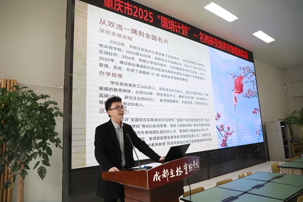 2025年11月6日上午,成都立格实验学校迎来重庆市“国培计划”名教研员培养对象培训班一行50余人,开展以“‘三新’背景下初中名教研员教研能力指导力提升”为主题的考察学习活动。此次活动旨在通过实地走访、课堂观摩与经验交流,促进两地教育理念的深度融合与教研能力的共同提升。