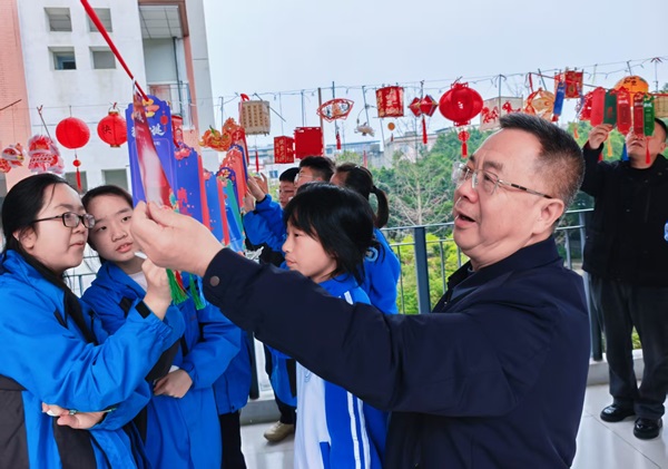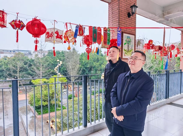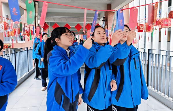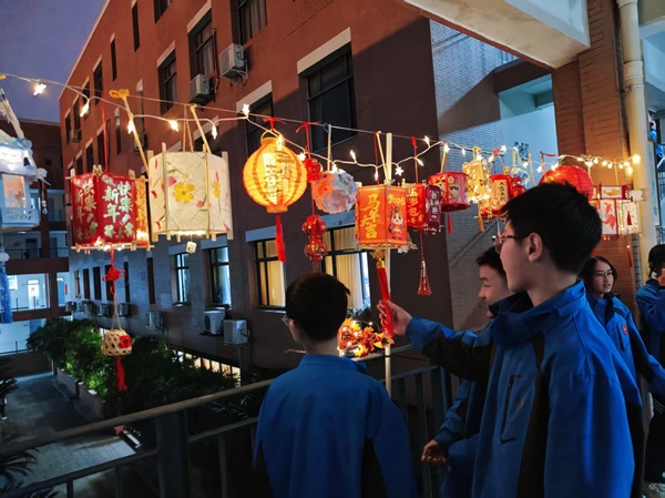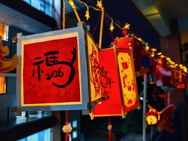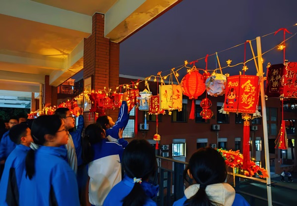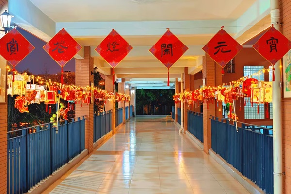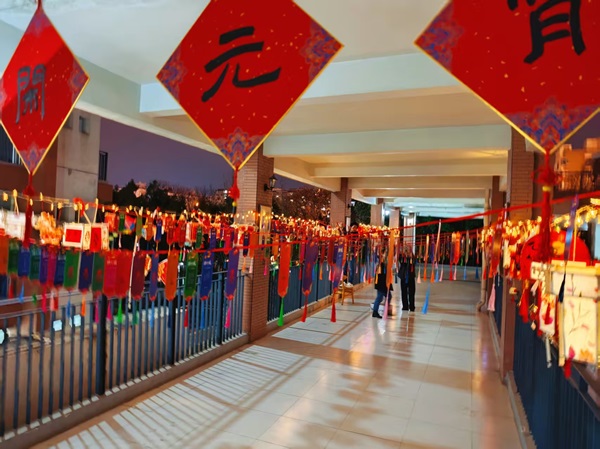 每一盏灯都凝聚着孩子们的巧思。不少灯笼内置了小彩灯,柔和的灯光透过彩纸洒落,将廊道映照得温暖而喜庆。微风吹过,灯穗轻摇,光影浮动,节日氛围扑面而来。师生们流连其间,驻足欣赏,在光影交错间感受着文字与艺术的魅力。